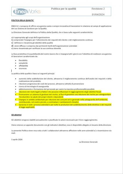 ENEA Srl si propone di offrire una gamma vasta e sempre innovativa di lavorazioni in relazione al campo di applicazione del suo Sistema di Gestione per la Qualità.